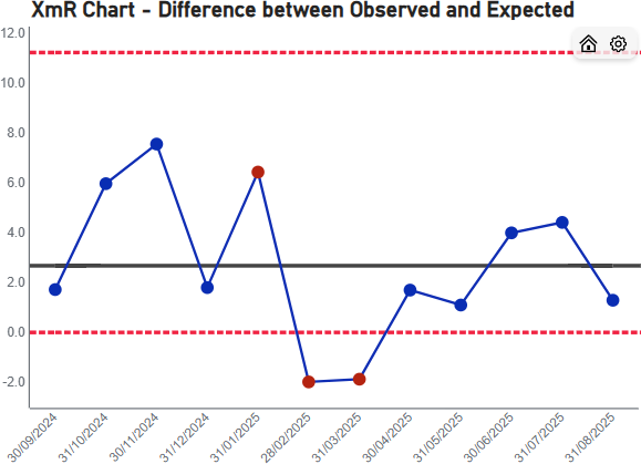 This means that whilst the observed to expected is a ratio it is not a rate or proportion. Such data cannot meaningfully be placed on a P chart. They must be charted using a XMR chart.